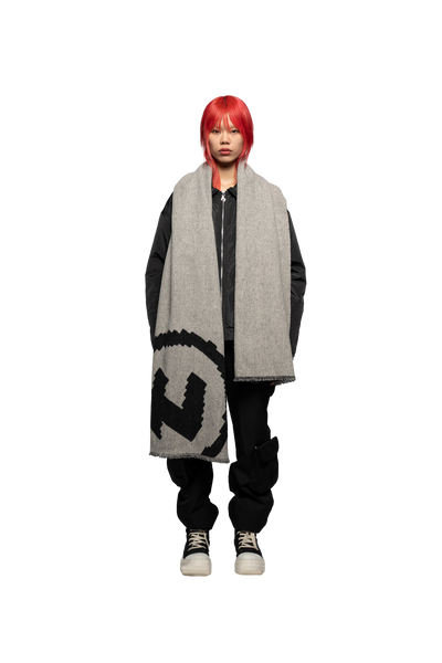 Our black and white oversized scarf from a warm, soft wool blend and features our pxiel circle logo.