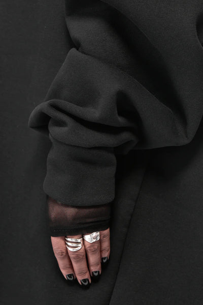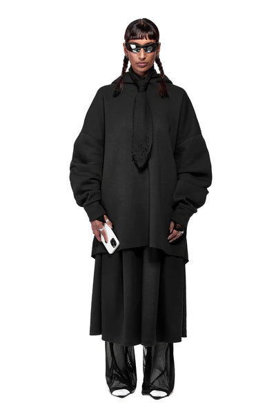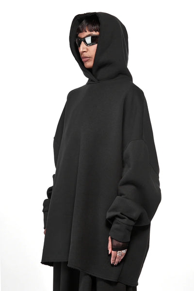 Double layered oversized hood with raw finishing details