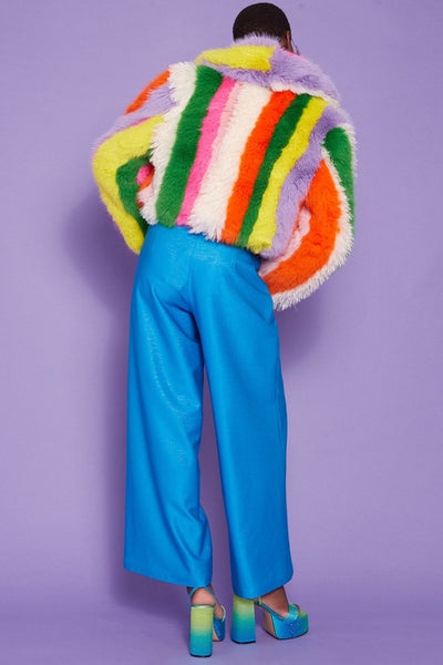 Dieser kurze Mantel wurde fachmännisch aus feinstem Bambus-Kunstfell gefertigt und ist wunderschön mit einem Regenbogenblockmuster gestaltet. Zusammen mit den tiefen Seitentaschen und dem Haken- und Ösenverschluss vorne ist dieser Mantel ein echtes Statement-Stück.